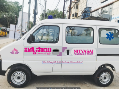 The Nithya Sai Charitable Trust provides free ambulance services, ensuring safe and timely medical care for poor and underprivileged patients in emergencies.